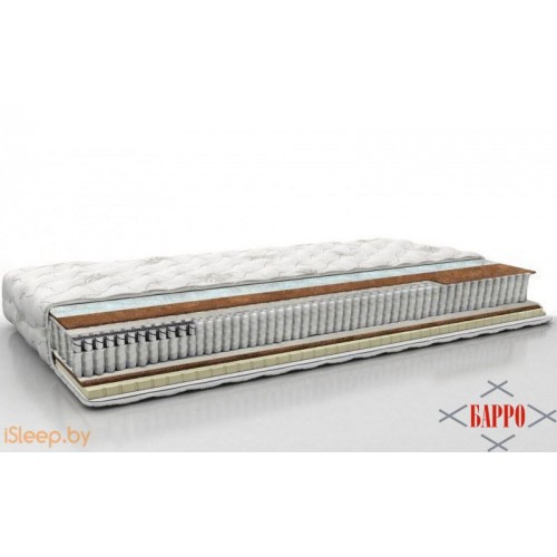 Барро Элит 548 - двусторонний матрас на блоке независимых пружин плотностью 256 штук на м2. С одной стороны в состав матраса входит кокосовая койра, она придает матрасу жесткость. Положительное воздействие оказывают жесткие матрасы при заболеваниях верхних отделов позвоночника. Со второй стороны используется кокосовая койра, которая комбинируется с латексом, тем самым делая поверхность среднежесткой.