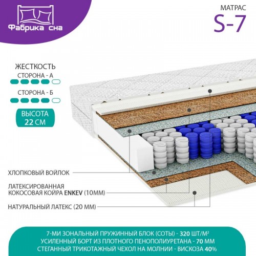Блок независимых пружин Pocket Spring с 7-ю зона жесткости, каждая из которых рассчитана на определённую нагрузку для точечной поддержки. Пружины расположены в шахматном порядке и находятся в отдельном чехле из нетканого полотна. Такие пружины работают независимо, что позволяет оптимально (точечно) распределять нагрузку тела, усиливая ортопедический эффект. Матрас с таким пружинным блоком обладает свойством идеально повторять контуры тела, что делает его максимально анатомическим. Благодаря точечной эластичности матраса у него отсутствует «эффект волны». Двуспальные модели такого матраса особенно подойдут для сна людям с большой разницей в весе. Плотность – 320 пружин на м2.
