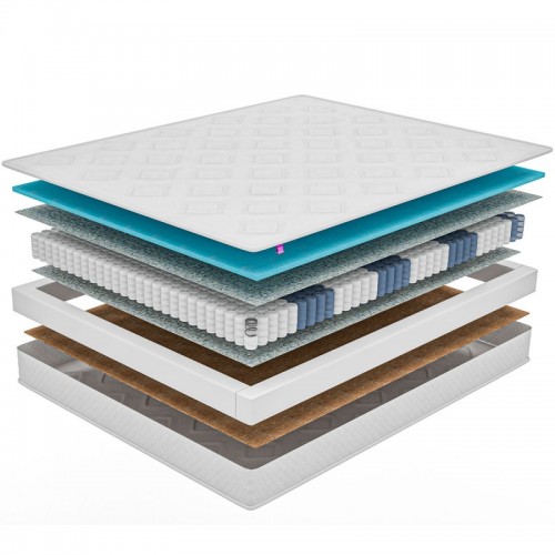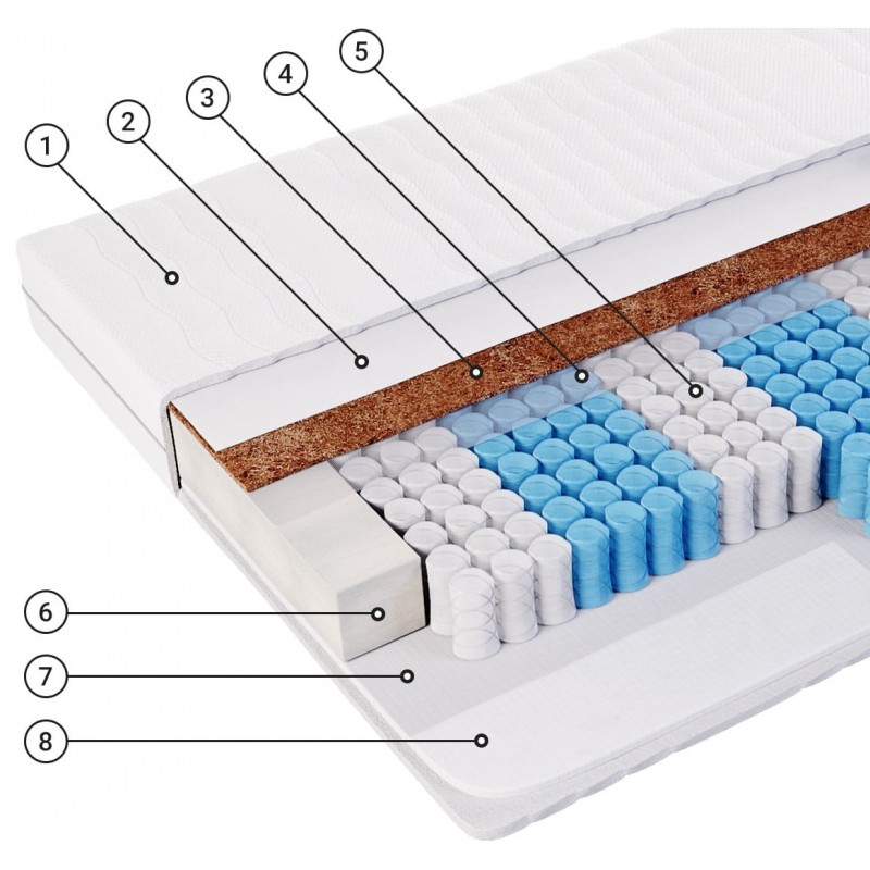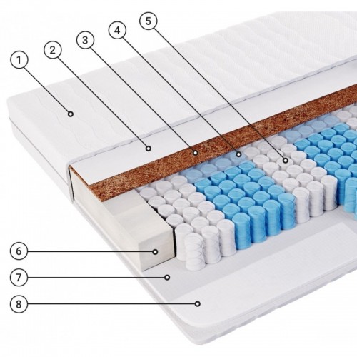 Блок независимых пружин TFK с 7-ю зона жесткости, каждая из которых рассчитана на определённую нагрузку для точечной поддержки. Это достигается использованием пружин разной жесткости, что дает заметное улучшение ортопедических свойств. Оптимизирует давление и наилучшим образом осуществляет функциональную поддержку позвоночника и обеспечивает индивидуальную жесткость для каждой зоны тела человека, что способствует хорошему сну и отдыху. Плотность – 256 пружин на м2.