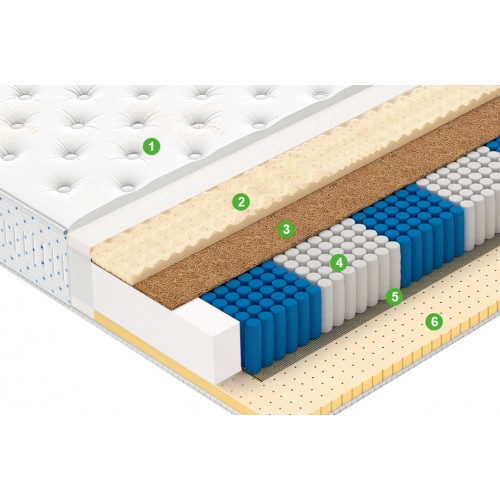 Блок независимых пружин из стали с выраженными 7 зонами поддержки. Чередование упругих и более мягких зон учитывает анатомию тела человека.
